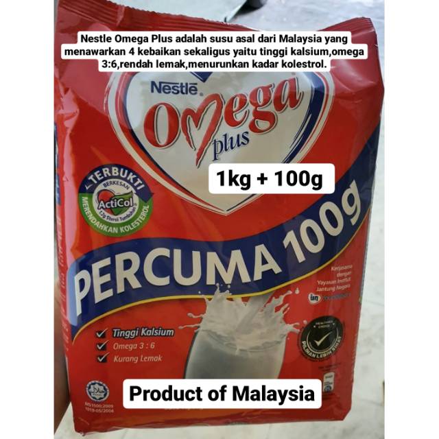 Nestle omega plus adalah susu asal dari malaysia yang menawarkan 4 kebaikan sekaligus yaitu tinggi kalsium,omega 3:6,rendah lemak,menurunkan kadar kolestrol . Adakah anda tahu apakah khasiat pengambilan susu omega? Diperbuat daripada kebaikan susu dan koko, versi terkini itu menawarkan satu pilihan minuman baharu buat sesiapa yang ingin menjaga jantung. Mengandung acticol untuk menurunkan kolestrol asid . Nestle omega plus milk powder harga review ulasan terbaik di malaysia 2022. Campurkan 200ml air suam dan 3 sudu besar susu nestlé omega plus.